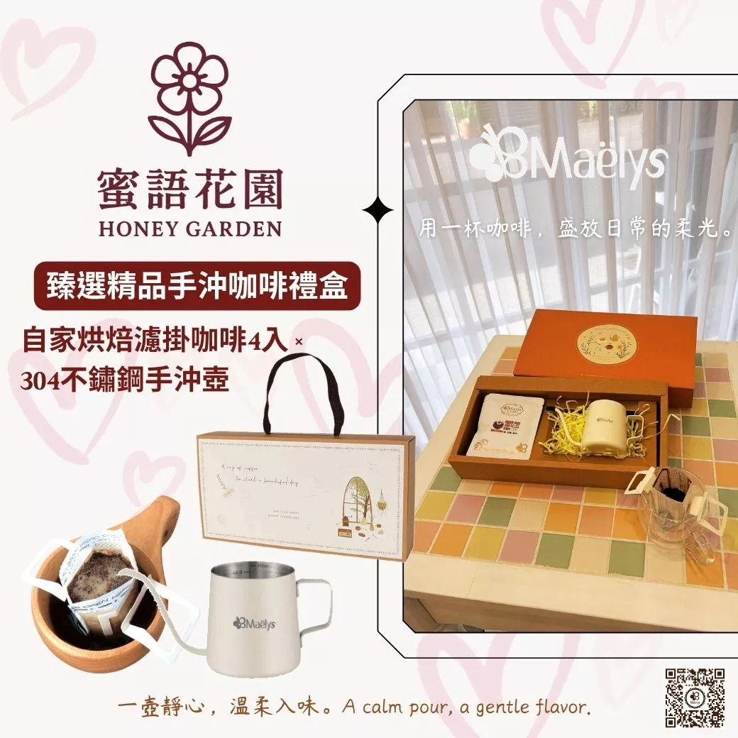 享受慢活生活,Maelys 蜜語花園手沖咖啡禮盒搭配自家烘焙濾掛咖啡與304不鏽鋼手沖壺,讓每一杯都溫潤香醇,輕鬆沉澱日常。