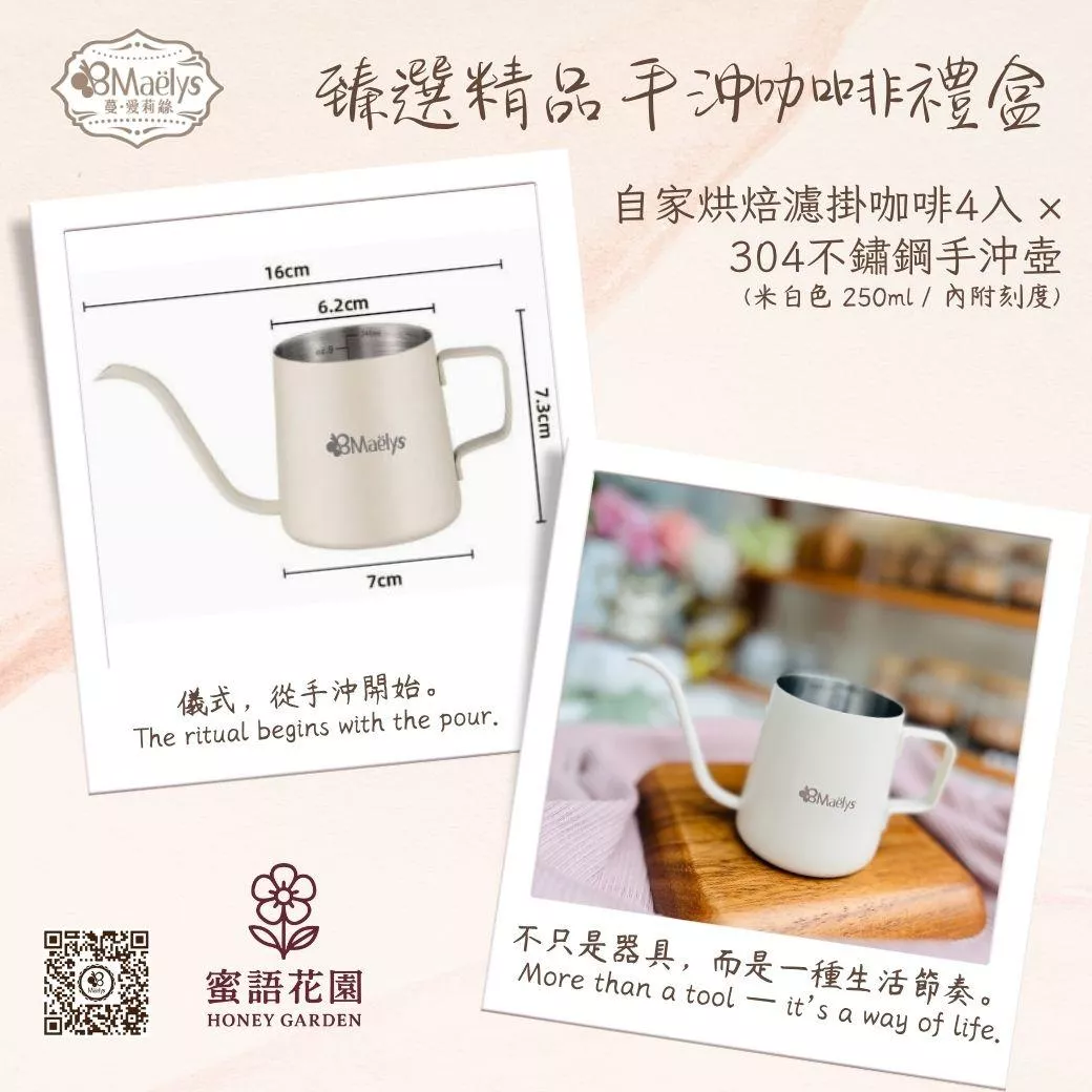 Between each pour, a quiet talk with yourself.享受慢活生活,Maelys 蜜語花園手沖咖啡禮盒搭配自家烘焙濾掛咖啡與304不鏽鋼手沖壺,讓每一杯都溫潤香醇,輕鬆沉澱日常。